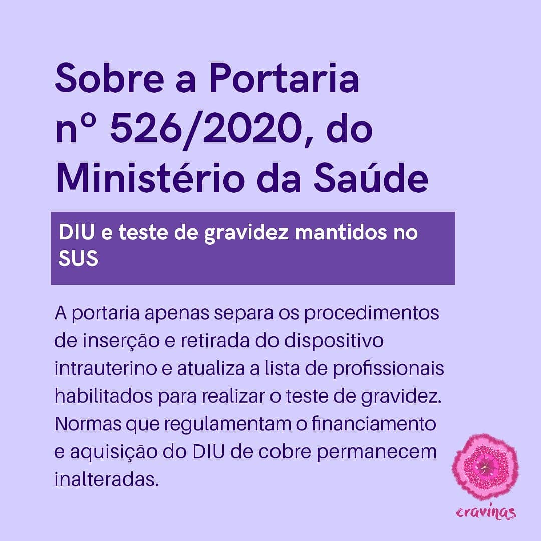 No dia 02 de julho de 2020, foi publicada no Diário Oficial da União (DOU) a Portaria nº 526/20 do Ministério da Saúde, que inclui, altera e exclui procedimentos da Tabela de Procedimentos, Medicamentos, Órteses, Próteses e Materiais Especiais do SUS. Por ocasião desta publicação, foram veiculadas matérias jornalísticas indicando que o órgão teria excluído o atendimento clínico para indicação, fornecimento e inserção do dispositivo intra-uterino (DIU) da Tabela de Procedimentos do SUS. Contudo, o que a portaria faz é apenas separar os procedimentos de inserção e retirada do DIU.