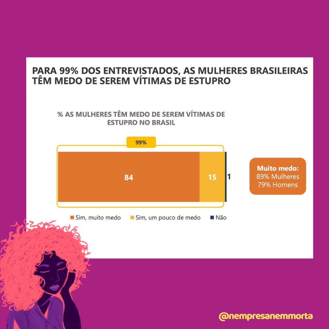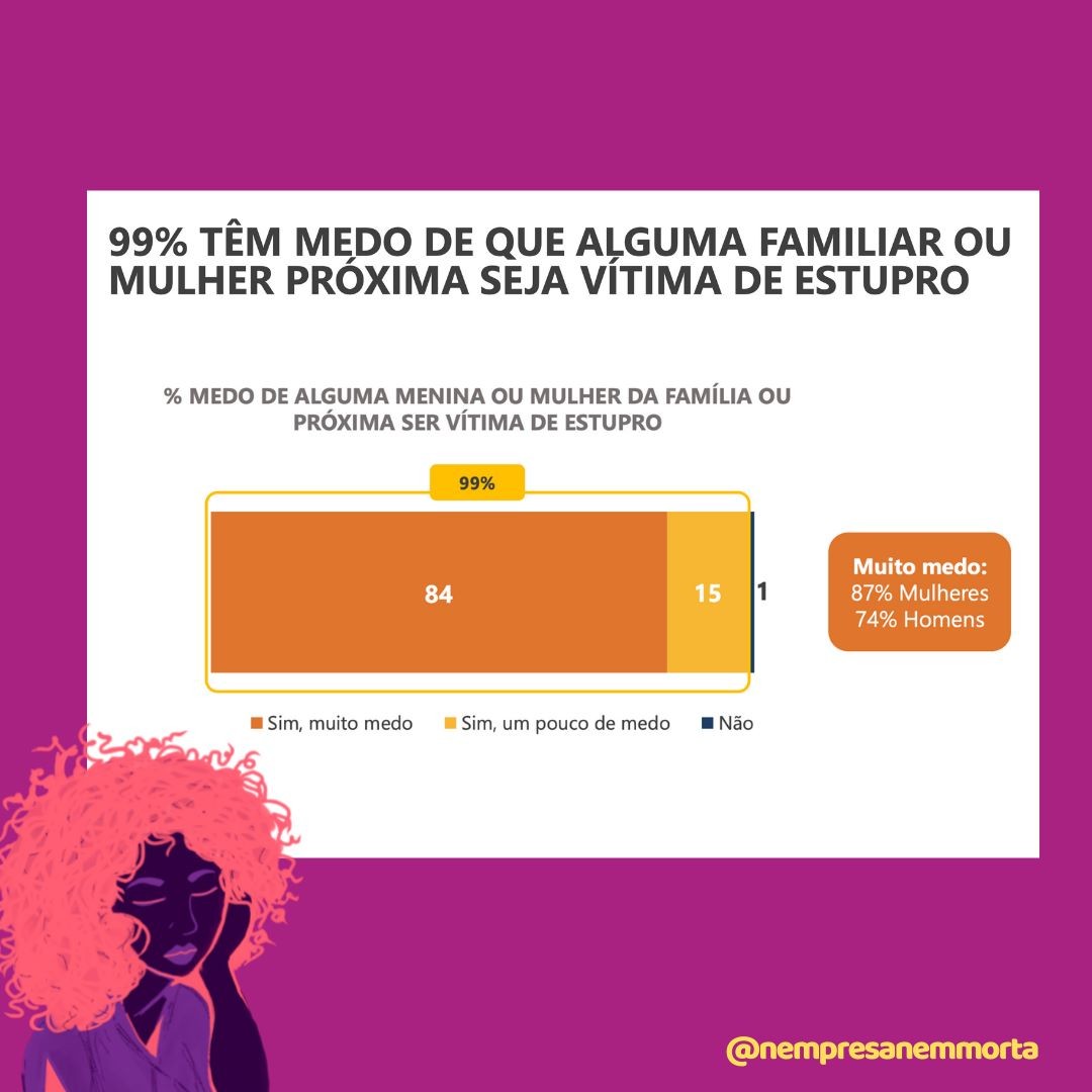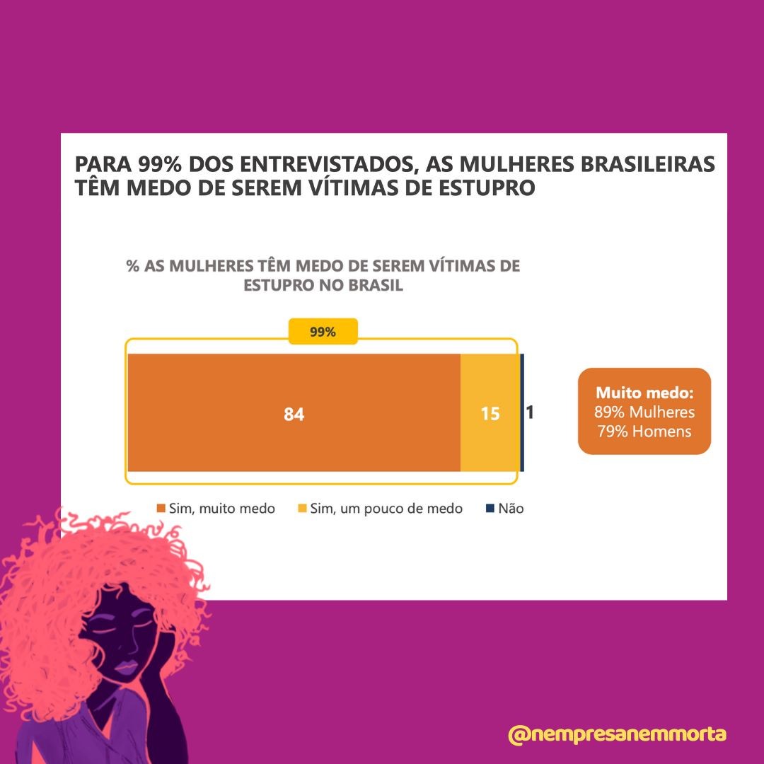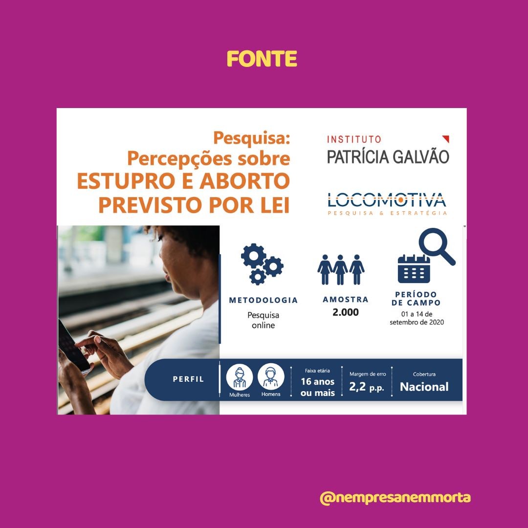 O Instituto Patrícia Galvão junto com Locomotiva Pesquisa & Estratégia, realizou, em setembro de 2020, a pesquisa: Percepções sobre o Estupro e Aborto Previsto por Lei. O levantamento foi feito de forma online e registrou a opinião de 2 mil homens e mulheres, com 16 anos ou mais de idade, em todo o Brasil. Dentre inúmeros indicadores, a pesquisa demonstrou com o medo do estupro é um temor generalizado que assola a população, incluindo aí homens e mulheres.
