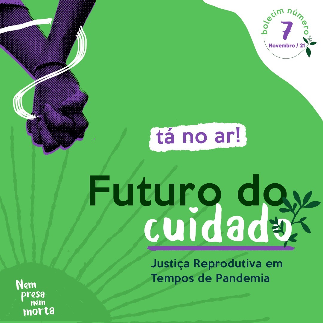#DescriçãodaImagem: Card com fundo verde. No canto superior esquerdo, mãos de duas mulheres entrelaçadas em tom roxo. No canto direito, Boletim número 7 de novembro/21 com uma folha de arruda na parte inferior. No centro, o texto: Tá no ar! Futuro do Cuidado e da letra “o” sai um raminho de arruda. Justiça Reprodutiva em Tempos de Pandemia. No canto inferior esquerdo, um sol em verde escuro, com finos raios e escrito em branco: Nem Presa Nem Morta. Fim da descrição.